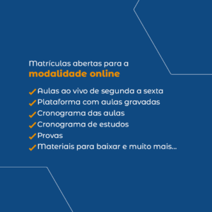 Aos que optarem pela modalidade online (EAD) terão todas as suas atividades de forma remota/online impossibilitando a transferência para modalidade presencial, não será necessário participar de nenhum processo seletivo ou ter pré-requisitos para modalidade online, basta e efetuarem o cadastro/assinatura, após isto, o candidato já se tornará aluno da modalidade online (EAD). as aulas ao vivo terão início em março 2024.